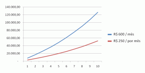 Para se ter uma idéia, investindo R$ 250 por mês a uma taxa de juros de 0,8% ao mês, tem-se em 5 anos cerca de R$ 20 mil. E em 10 anos, este valor sobe para quase R$ 52 mil.